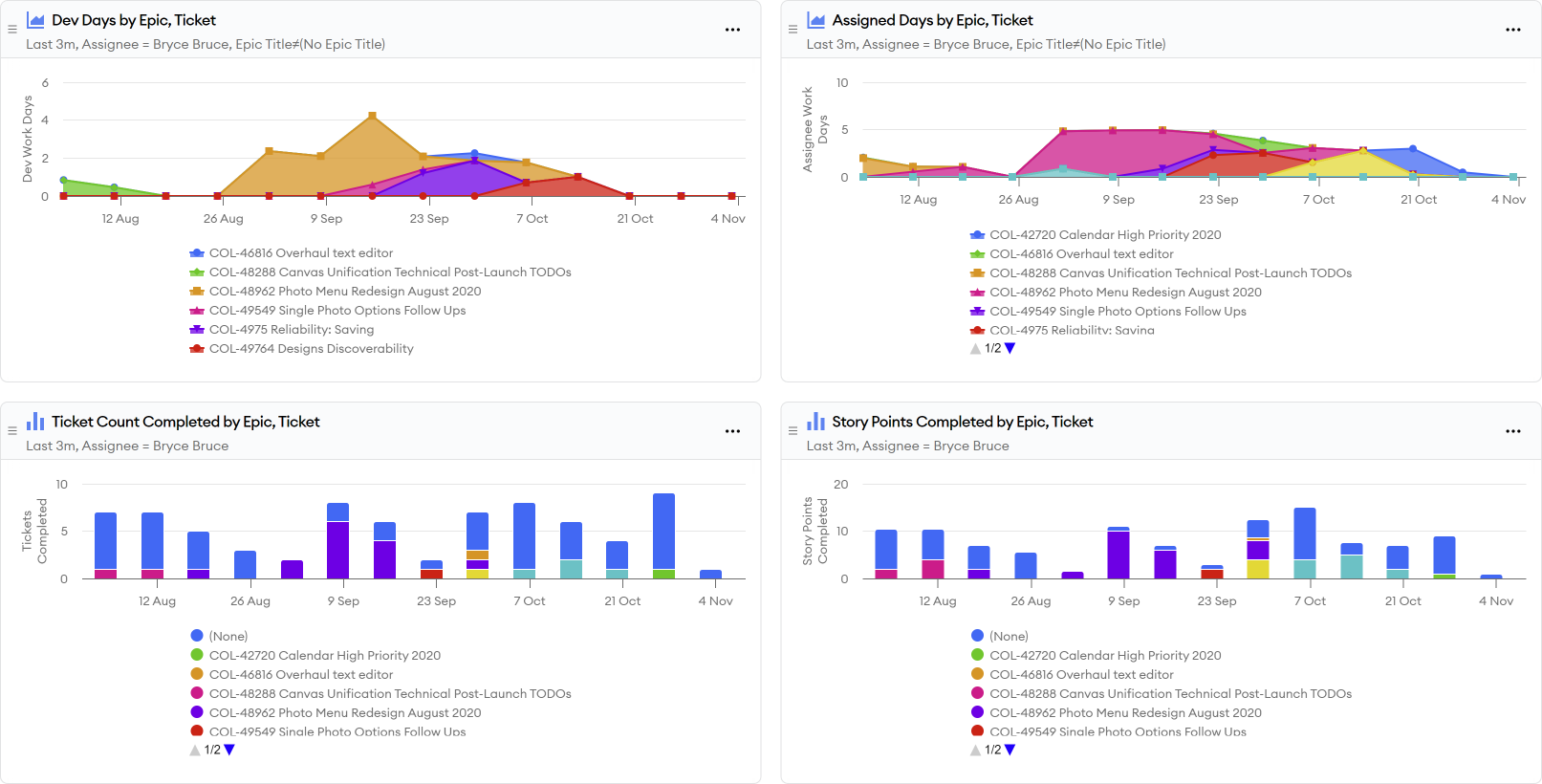 The detail report shows where a person’s time went grouped by epic, ticket, and pull request over time.